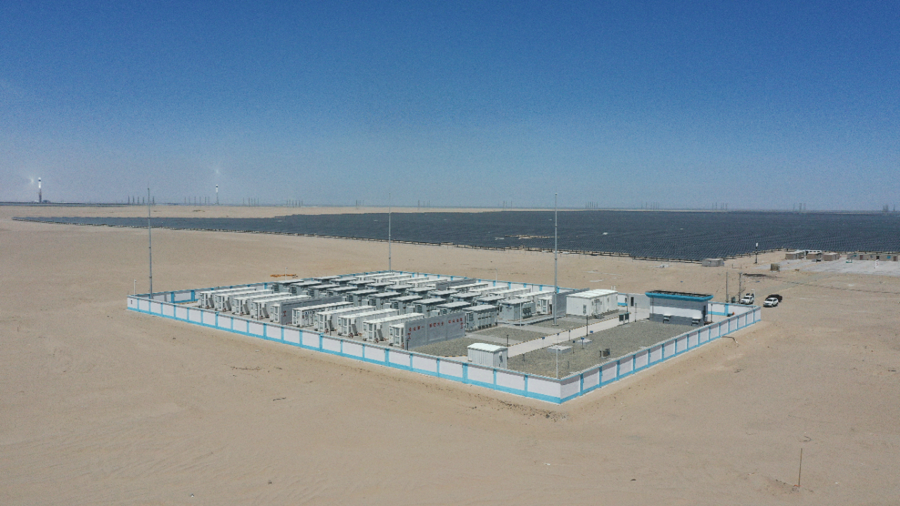 ▲戈壁上的三峽海西基地100萬千瓦光伏配套儲能電站